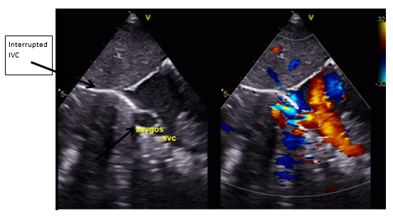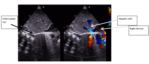 Postnatal ECHO revealed an Interrupted IVC (Figure 1) with venous return via the azygos vein (Figure 2 & Figure 3), draining into the superior vena cava (SVC), hepatic veins draining directly into the right atrium (RA), SVC draining into the RA and a small patent foramen ovale (PFO) with left-to-right shunting with normal cardiac anatomy with no abnormalities of the valves, aortic arch, outflow tracts, and no outflow tract obstruction.