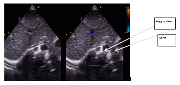 Figure 2: Subcostal echocariographic situs view showing Azygos vein instead of IVC (IVC is usually seen on the right side and more superiorly).