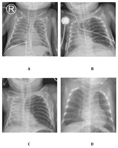 Image 1. A Bilateral PIE , B Unilateral PIE, left lung overdistension with mediastinal shift , C Unilateral PIE with diminution of overdistension D No signs of PIE or overdistension.